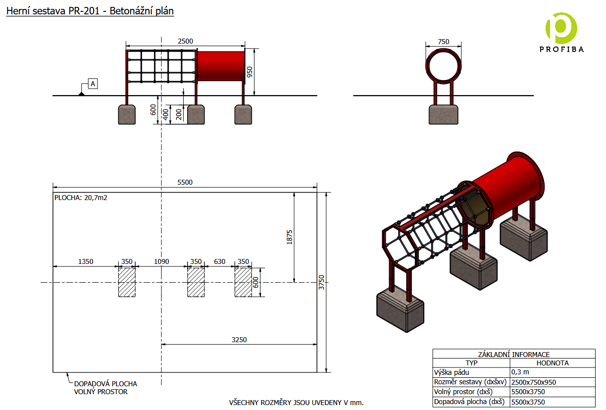 Průlezka je určena dětem od 2 - 14 let a prolézací část tvoří polypropylenová lana s ocelovým jádrem a laminátový tunel.