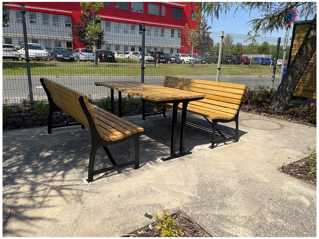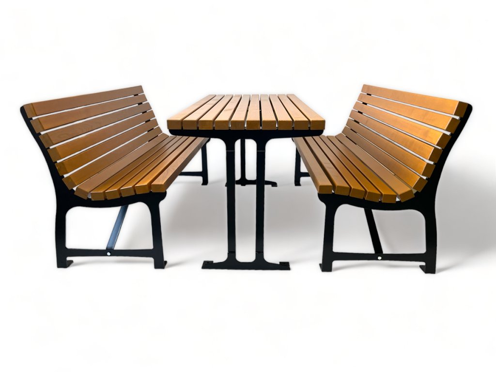 Kovové nohy lavičky jsou lakovány ekologickou práškovou barvou v odstínu RAL 9005 - černá matná. Prášek je nanášen elektrostaticky a následně vypalován ve speciální peci. Tato technologie je označována jako komaxit nebo také jako práškové lakování.