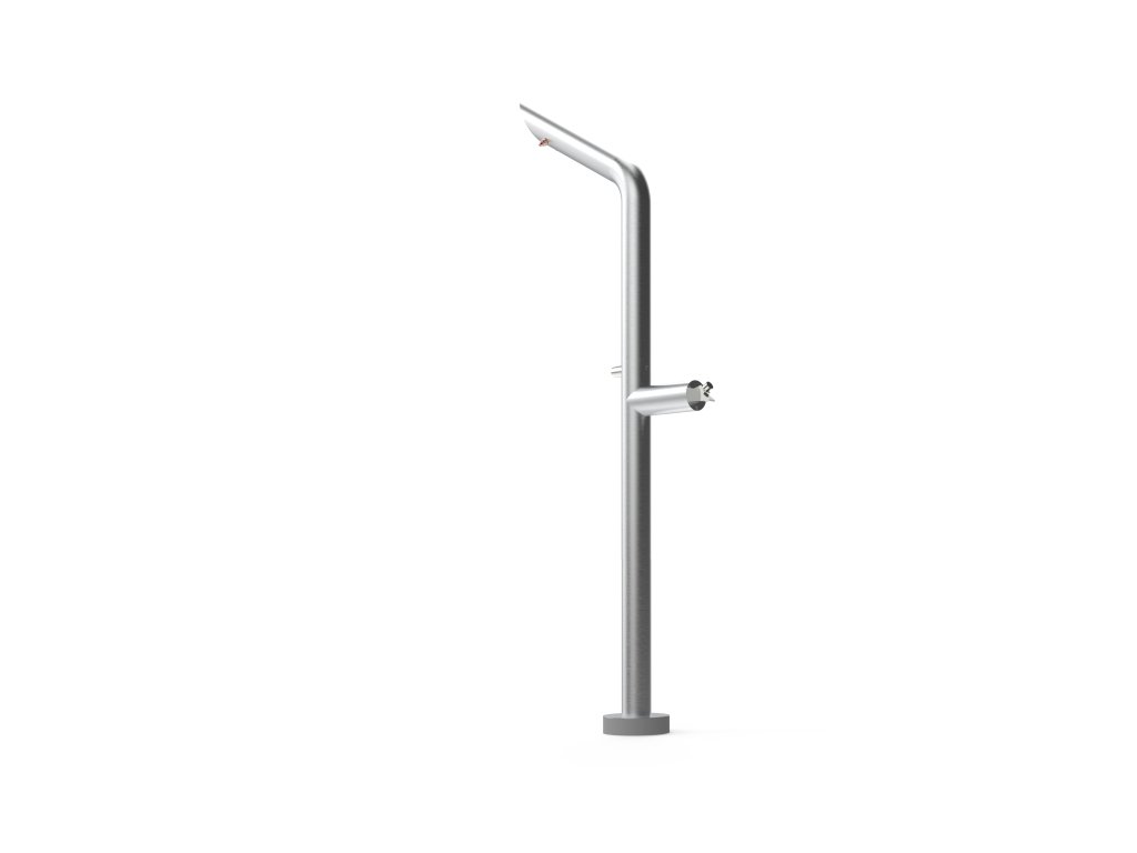 Kombinovaná nerezová mlžící sprcha a pitná fontána v jednom. Jedno napojení pro dvě funkce – úspora při montáži i pořízení. Ideální pro veřejná prostranství, parky, školky i soukromé zahrady.