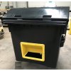 Velký plastový kontejner s výsypovým otvorem a spodní ocelovou konstrukcí.